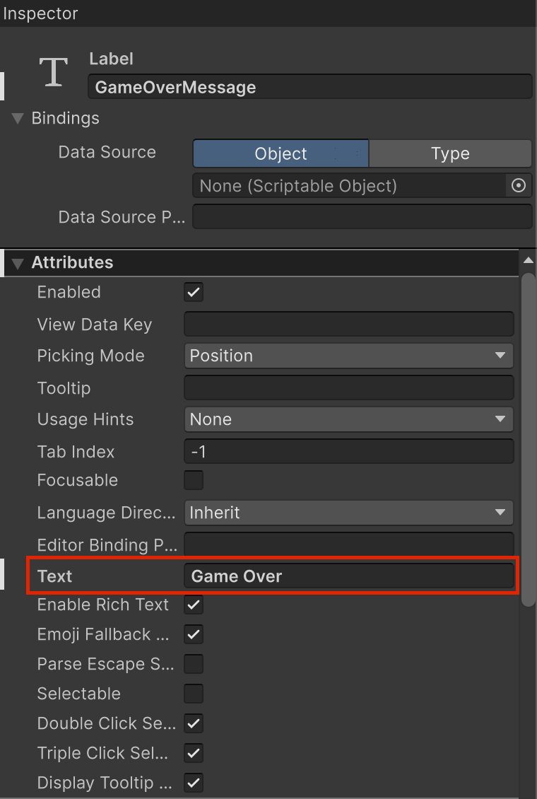 6. With GameOverMessage selected, use the foldout (triangle) to expand the Attributes section and set the Text property to “Game Over”. Then use the foldout (triangle) to expand the Inlined Styles section, then the Text section and change the Font, Size, and Color of the text to make it visible on the dark background.