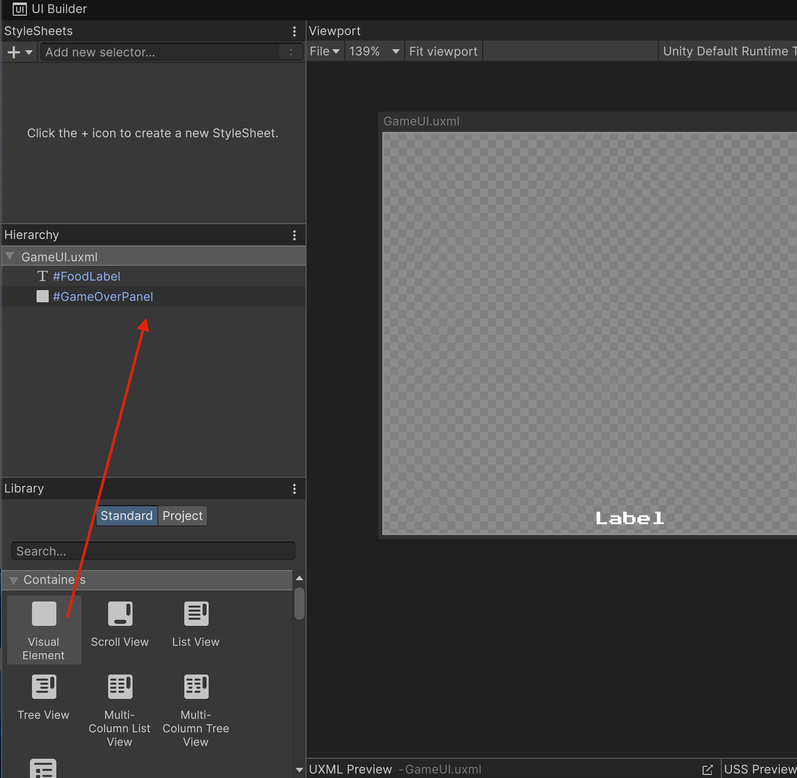 2. In the Library window, in the Containers section, click and drag a VisualElement into the Hierarchy window and rename it “GameOverPanel”.