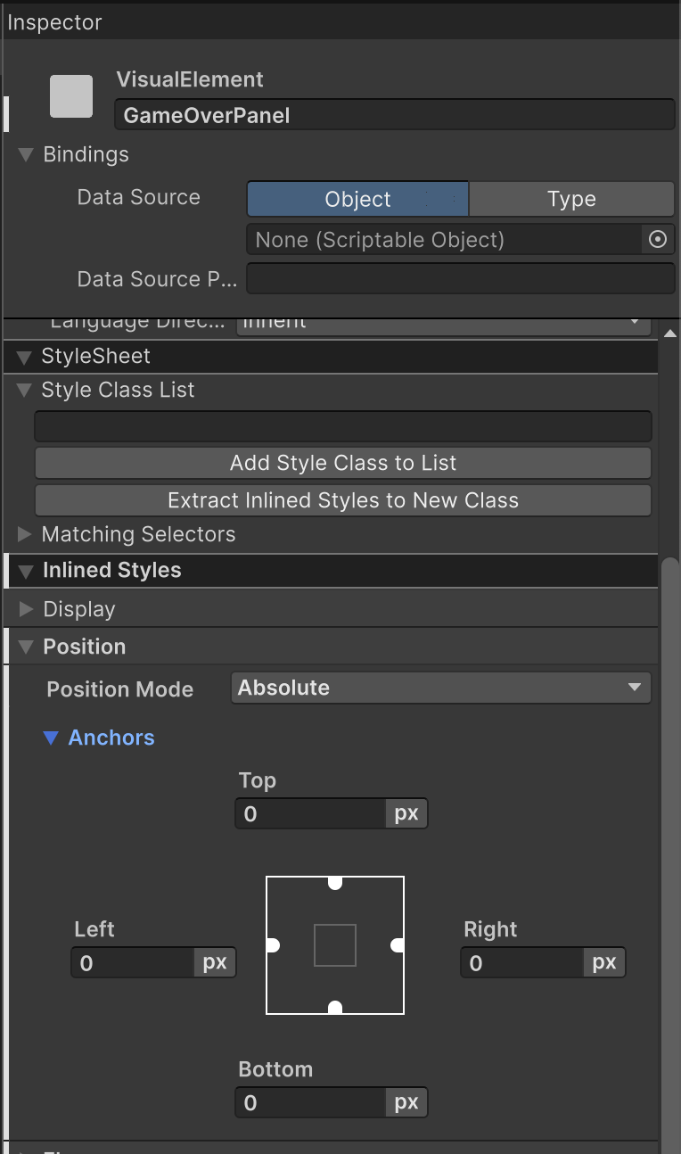 3. With the GameOverPanel Element selected, use the foldout (triangle) to expand the Position section in the Inspector window, then open the Position Mode dropdown and select Absolute and set the Top, Right, Bottom and Left offsets to 0, to make sure it covers the entire screen.