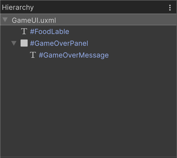 m_GameOverPanel.style.visibility = Visibility.Hidden;Note: The reason we use the Query (Q) function on the GameOverPanel to retrieve the message GameOverMessage Label Element is because we know it’s a child Element of the panel; this way, there’s no need to run the query over the whole hierarchy.