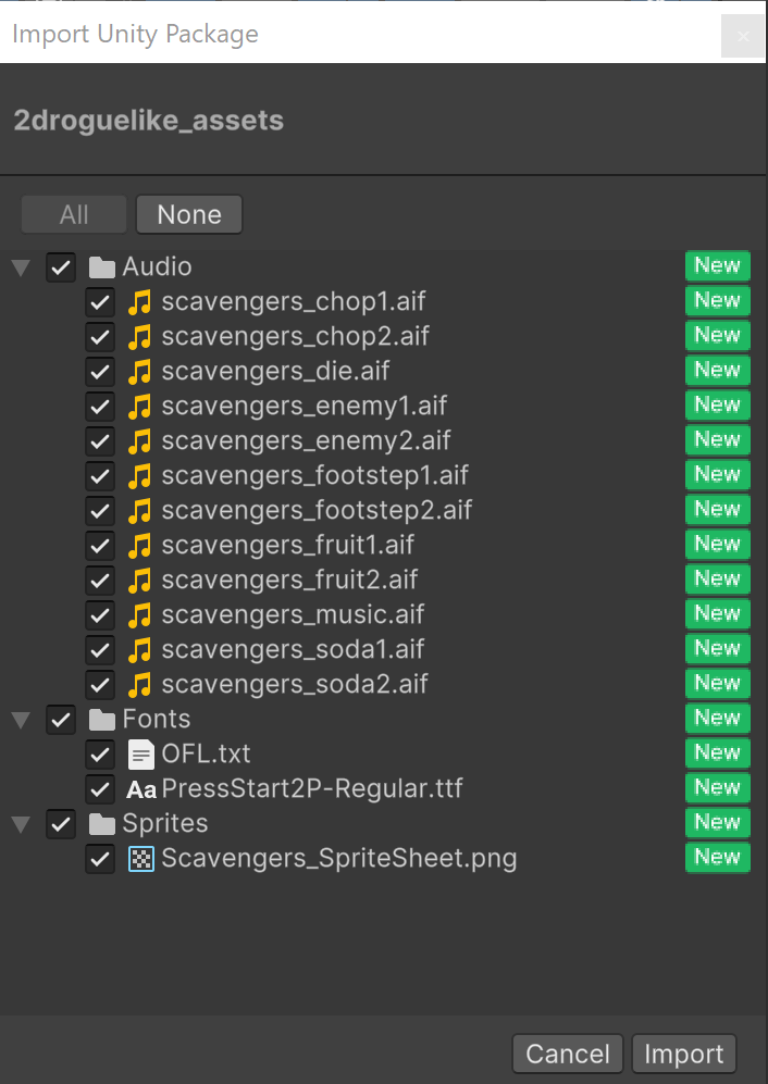 The Import Unity Package window will open, listing all the assets this package will import into your project.