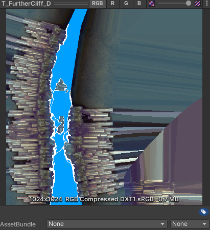 The following is an image of a Texture used in a 3D Scene to give a cliff its many details, such as jagged rocks and the river that flows beside it.