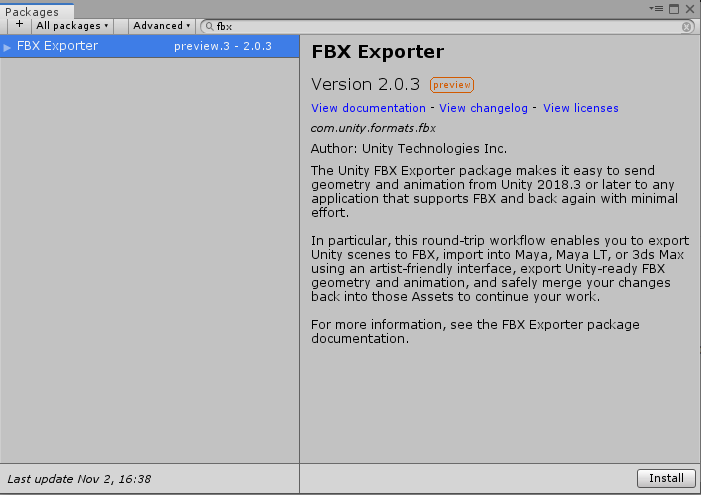 1. Add the FBX Exporter package by opening Window > Package Manager.