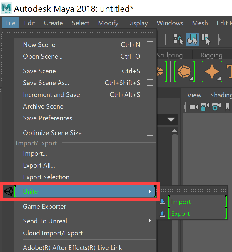 9. The plug-in will install and open the selected DCC application. The FBX Exporter options will be located in the File drop-down under a custom Unity flyout (Figure 05).