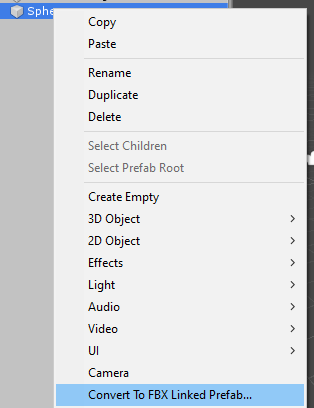 2. In the Hierarchy, right-click over the object and select Convert to FBX Linked Prefab (Figure 06).
