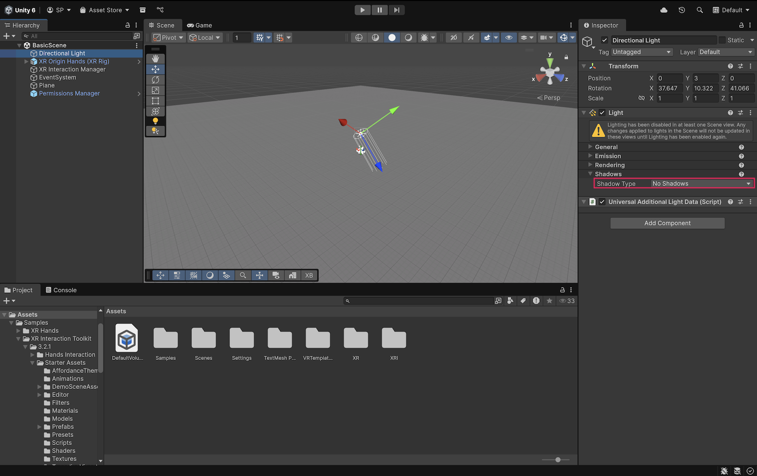 To begin, you’ll add the core components that are needed for hand tracking and turn off shadows, which aren’t necessary for this basic interaction scene.