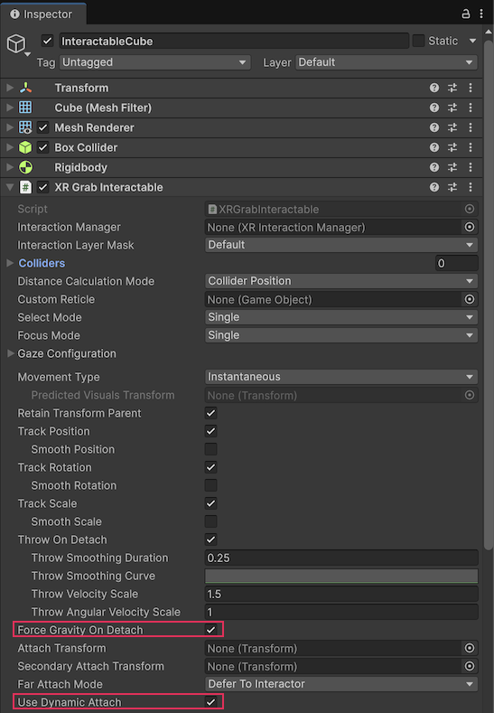 The Use Dynamic Attach property keeps the cube from snapping too close to the hand, and the Force Gravity On Detach property simulates realistic throwing.