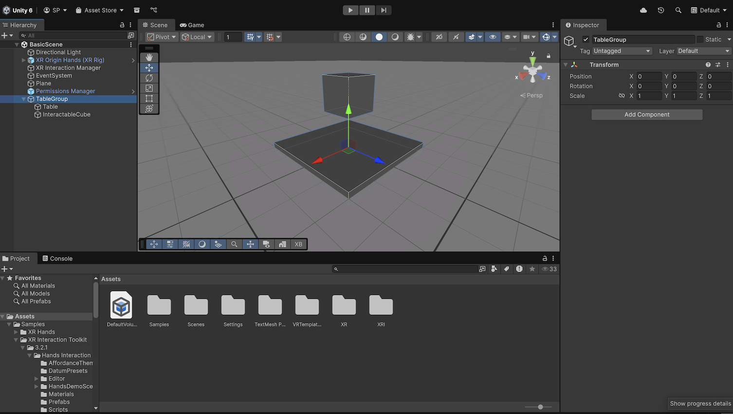 10.  Select TableGroup GameObject and set its Transform component’s Position property to X = 0, Y = 1, and Z = 0.7 so the scene appears comfortably in front of the user in seated XR.