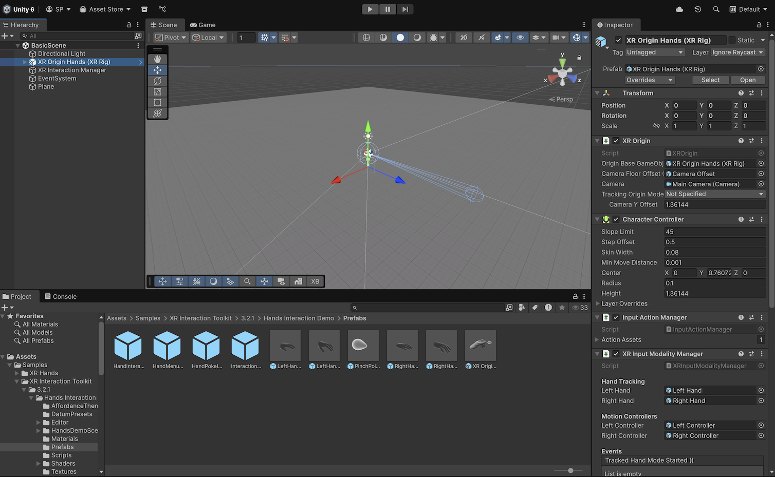 This prefab includes preconfigured XR Hand GameObjects for poke and pinch interactions, as well as useful components like the XRInputModalityManager, which automatically switches between hands and controllers depending on the input source.