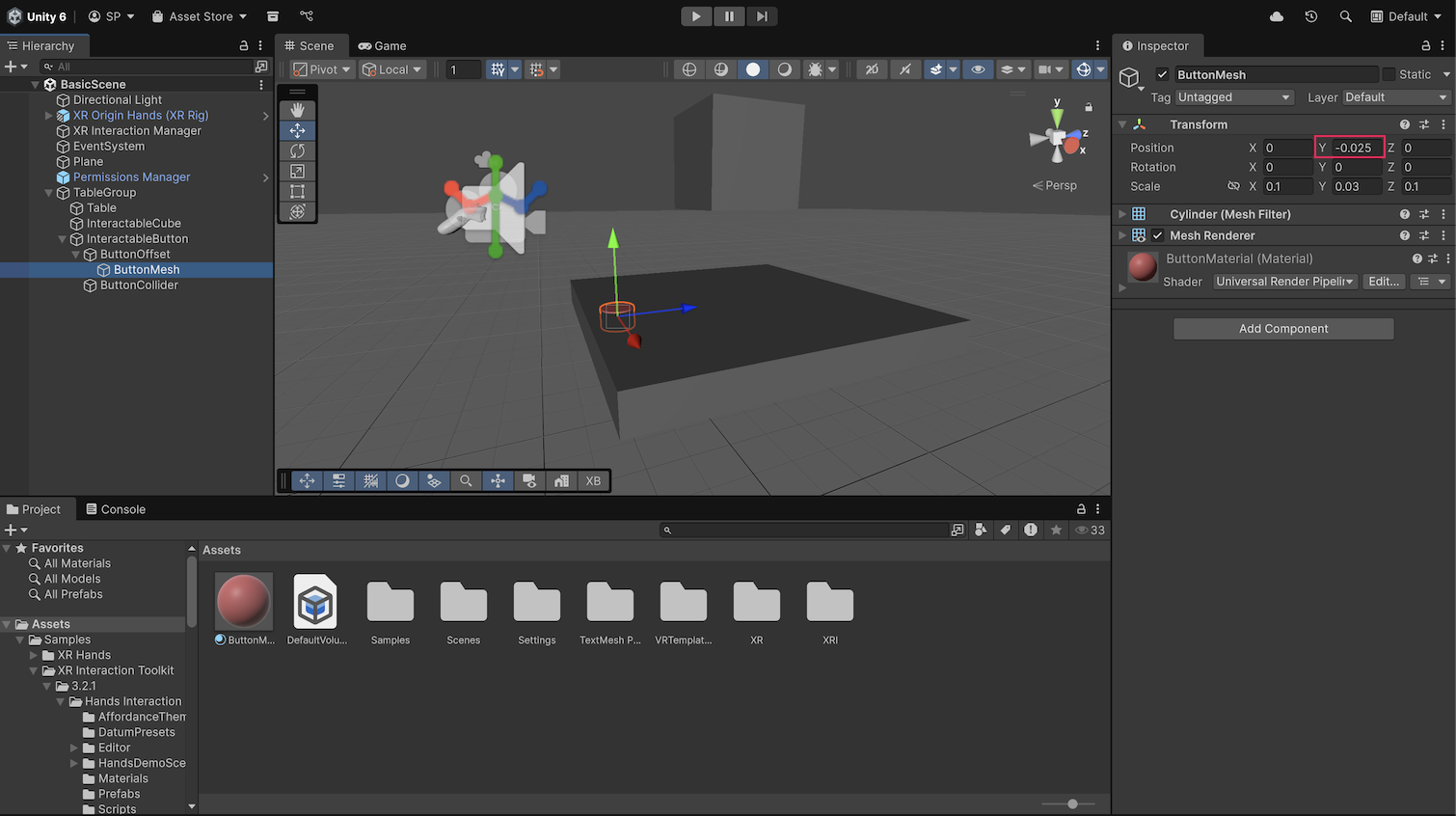 1. Select the ButtonMesh GameObject and set its Transform component’s Position Y property to -0.025 to simulate the pressed position of the button.