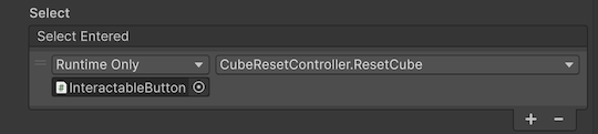 1. In the Hierarchy window, select the InteractableButton GameObject, add the CubeResetController script component, and click and drag the InteractableCube GameObject’s Rigidbody component into the Cube Rigidbody property box.
