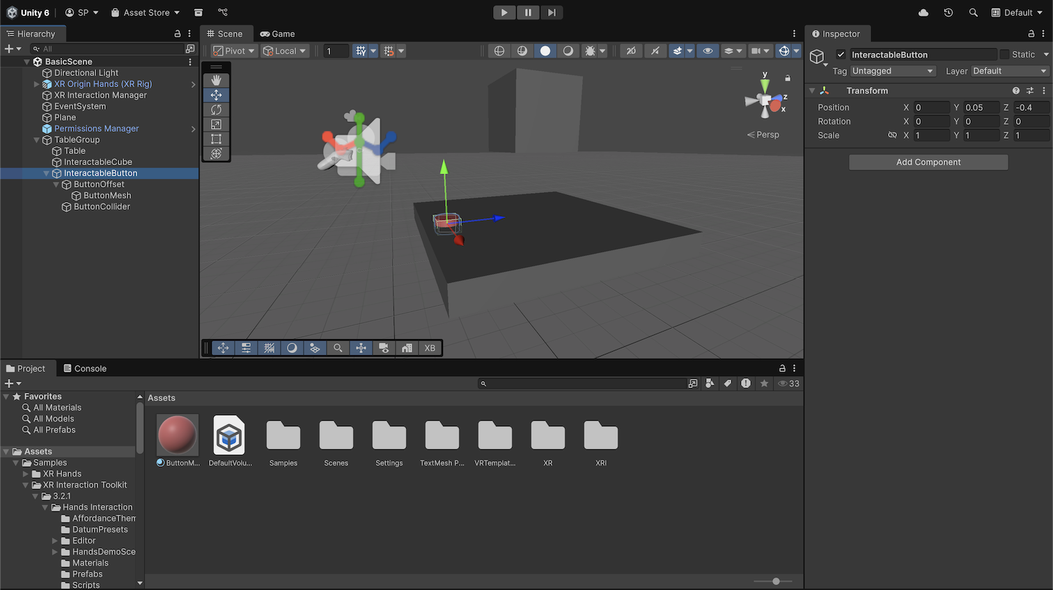 In this step, you’ll enable the button to respond visually to poke gestures using XR Hands.
