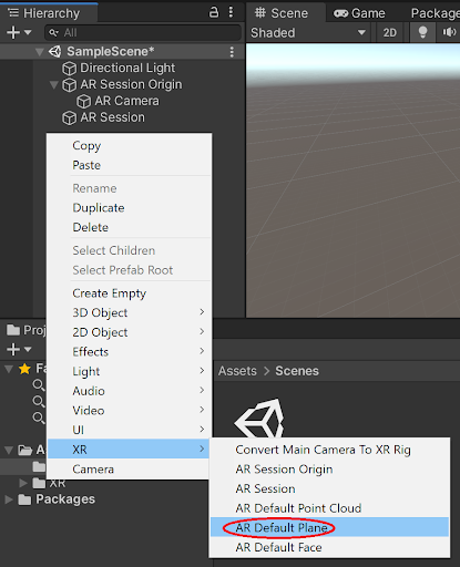 1. Create an AR Default Plane object in the Scene view by selecting GameObject > XR > AR Default Plane from the context menu that appears (Figure 3)