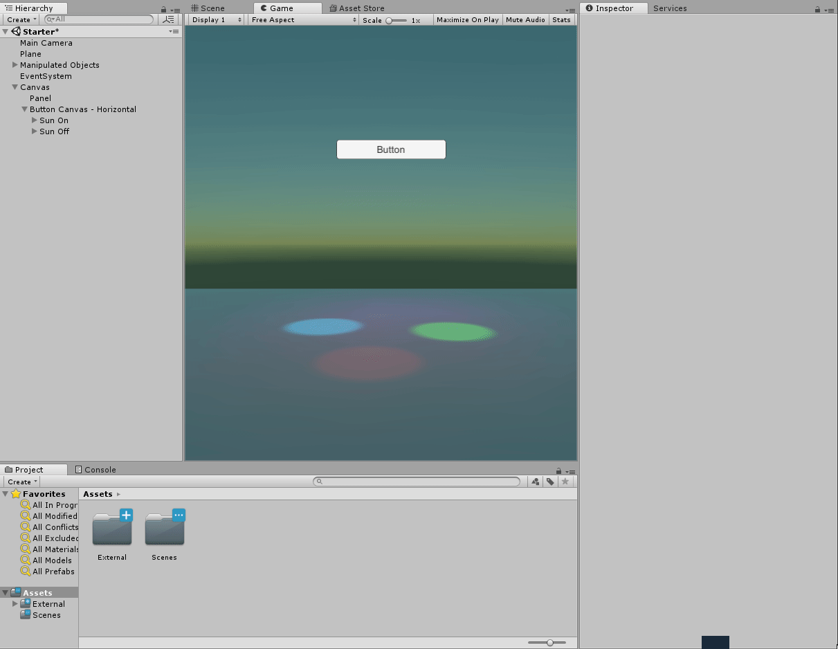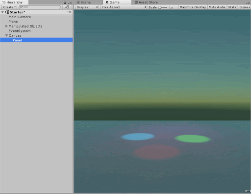 The answer is nothing. Nothing should happen until we link the buttons to the objects in the Scene. Right now, the toggles will turn on and off and the slider will drag, but the objects in the Scene won’t react.