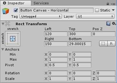 - Adjust the padding/spacing until the buttons are aligned in the middle. (Hint: Review the Rect Transform values below.)