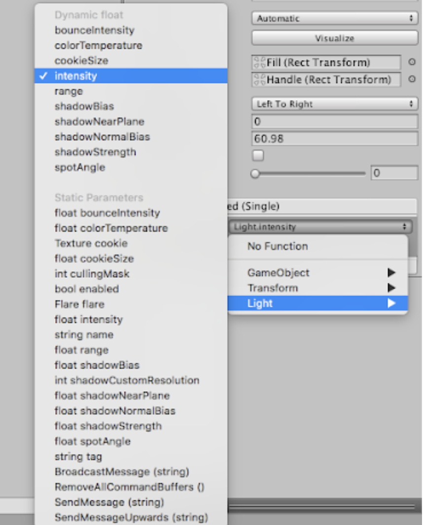 - In the Inspector, set the logic to adjust the Light.intensity parameter so we can control the light’s intensity: On Value Changed > Light > Intensity.