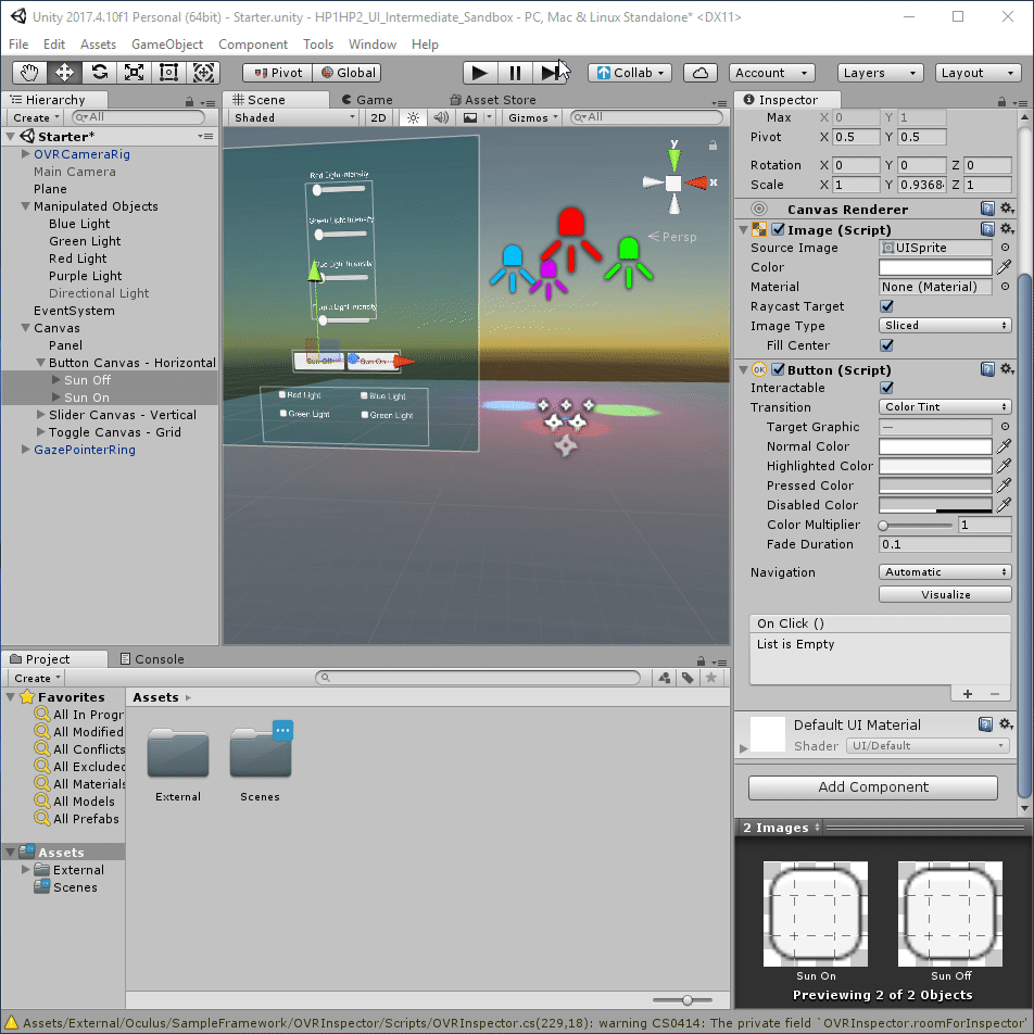 - Duplicate the button, name it Sun On, and adjust the two buttons’ positions so they sit at the bottom of the Canvas panel.