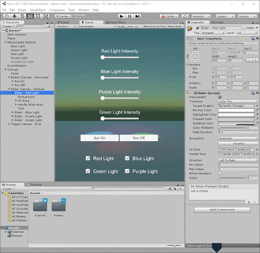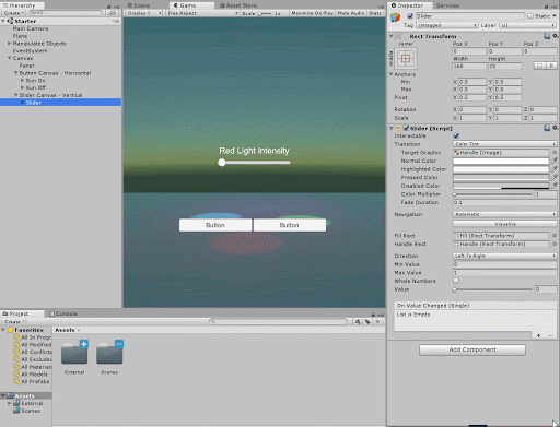 - To control the intensity of the Scene’s red light, follow the same steps with the Red Light Slider as with the buttons, but drag the Red Light GameObject into the reference.