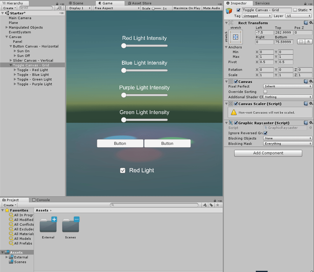 - Create a new Canvas as a child of the first Canvas and name it Toggle Canvas - Grid. This Canvas will hold all of our toggles' GameObjects, which is important when we align them as a grid.