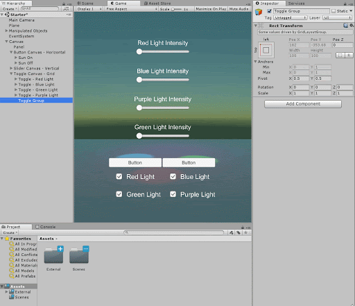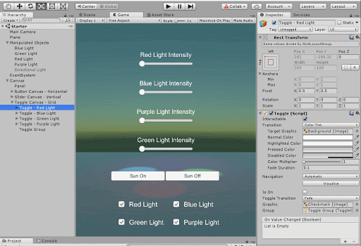 Add a Toggle Grid and space the toggles evenly with the Grid Layout Group component so to turn each light (red, blue, purple, green) on and off.