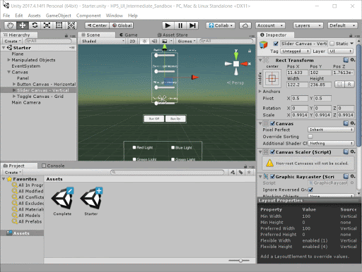 Add a UI component called a Slider to manipulate the intensity of each colored light in the Scene. Adjust the Slider’s spacing by adding a Vertical Layout Group component to the parent Canvas.
