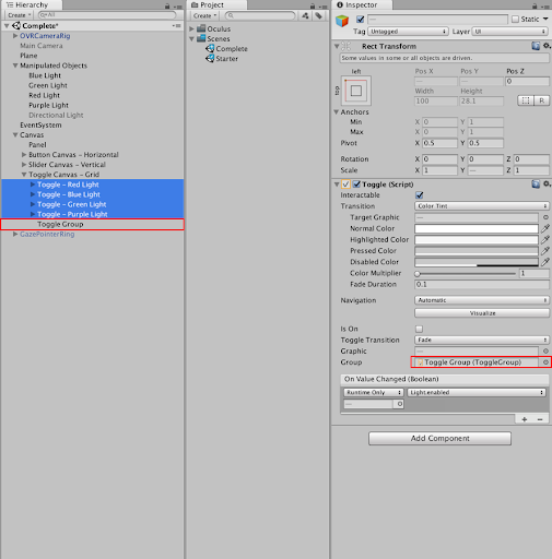 - Change the text labels on all four Toggle Groups to Toggle - Red Light, Toggle - Blue Light, Toggle - Green Light, and Toggle - Purple Light.