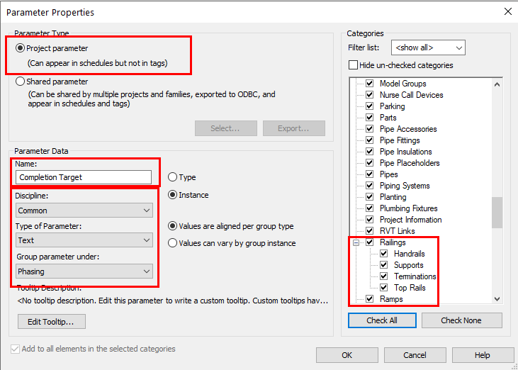 3. Create a new project parameter called Completion Target and fill out the rest of the options as shown. Take care to expand all the options under the categories and make sure everything is checked (Figure 03).
