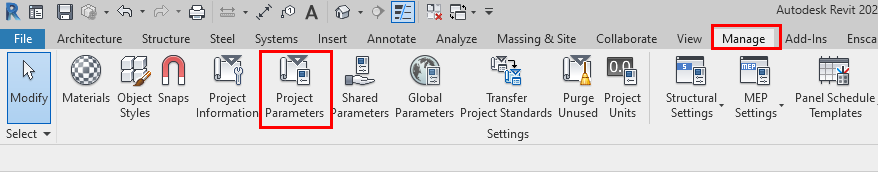 2. Go to the Manage Tab and select Project Parameters in the Settings section (Figure 02).