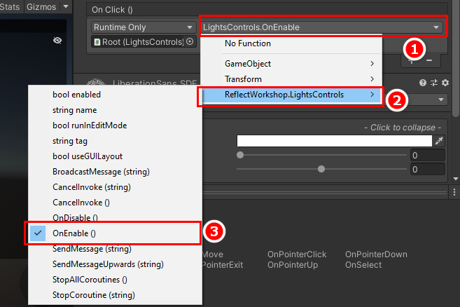 7. Select the OnEnable () method from the list of functions by (1) selecting the drop-down menu, (2) Selecting ReflectWorkshop.LightsControls and (3) selecting OnEnable(). These functions come from the script added onto the Root object, which in turn was dragged into the button slot (Figure 06).