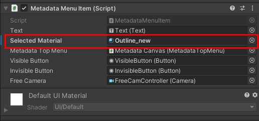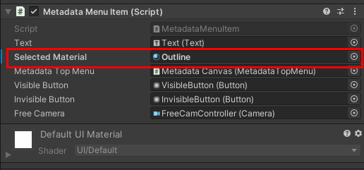 The highlight Material can be found in the Inspector as well. In the Hierarchy, navigate to Reflect > Canvas > Metadata Canvas > MenuTemplate > MenuItemTemplate.