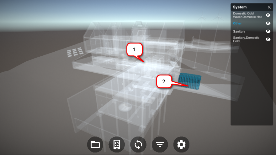 Typically, when Reflect Viewer’s highlighting system is activated and an element is selected, the selected object is highlighted while the rest of the project elements become transparent (Figure 01). To achieve this, Reflect Viewer assigns a transparent material (1) to all unselected objects and a highlight material to the selected object (2).