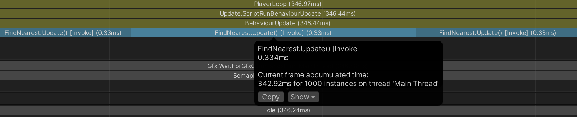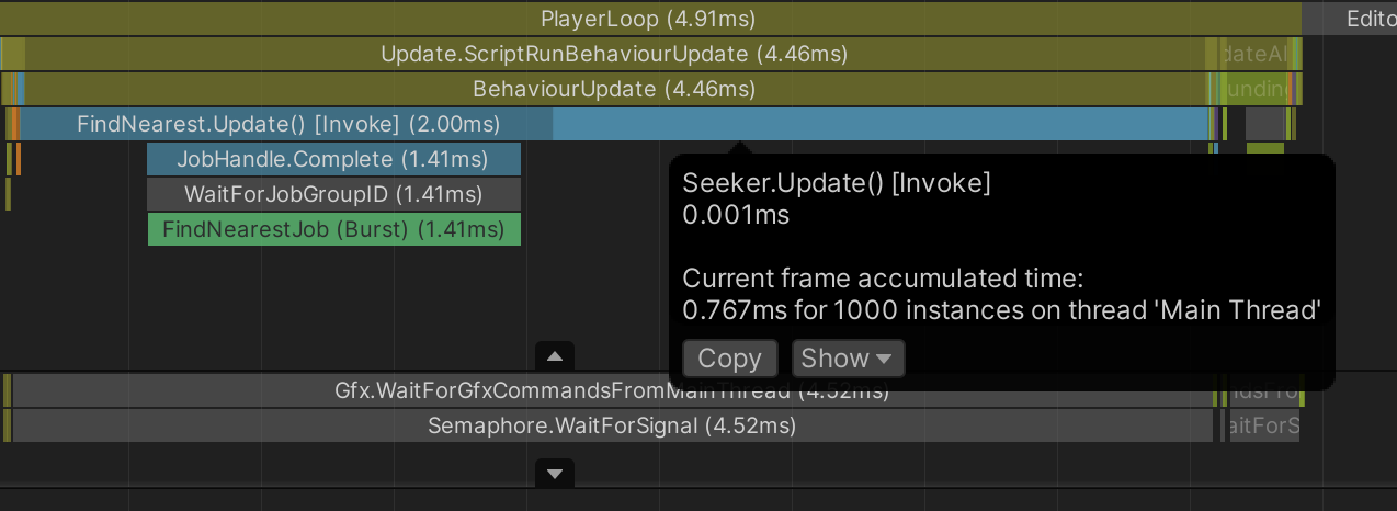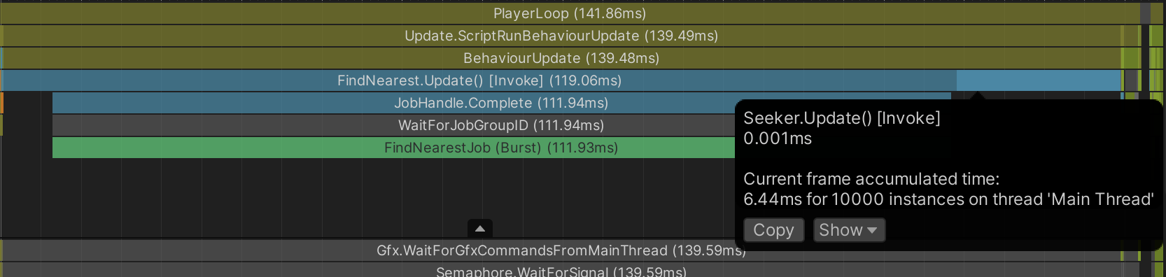 Now when you enter Play mode and profile the result, a typical frame with 1000 Seekers and 1000 Targets without Burst compilation looks like the profile below.