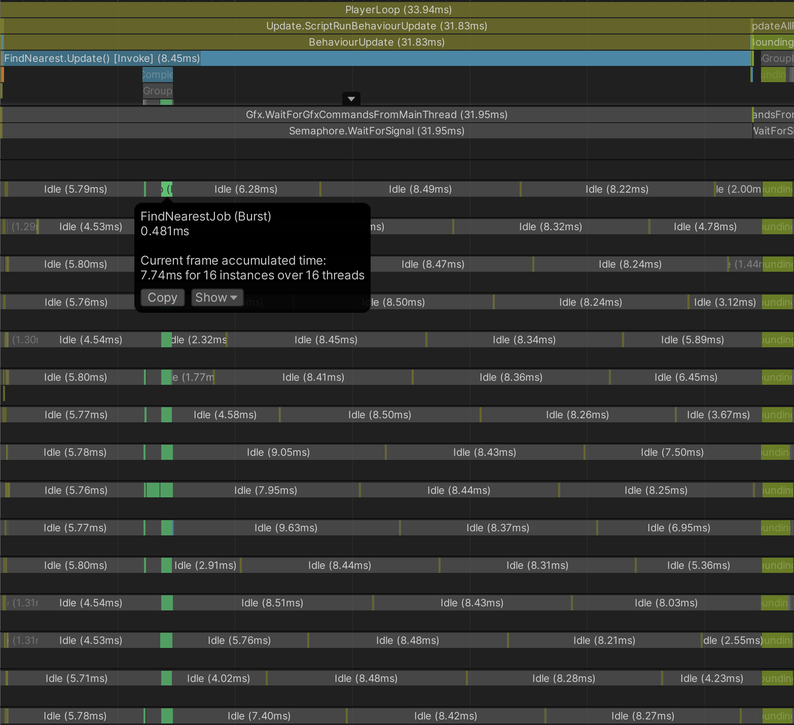 The FindNearestJob takes just ~7.5 milliseconds total CPU time and ~0.5 milliseconds from start-to-end.