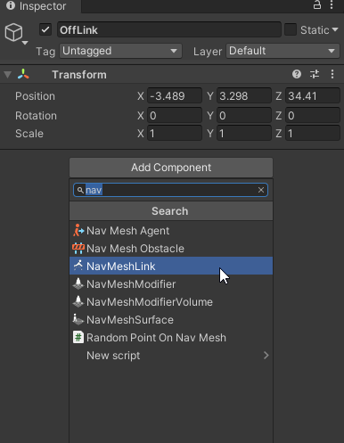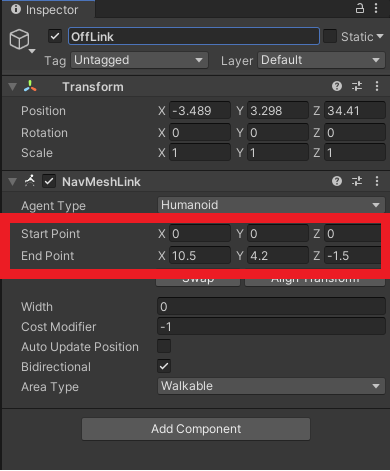 1. Create a new GameObject called OffLink and position it at the highest balcony in the scene (around (-3.5, 3.3, 34.5), and add a NavmeshLink Component to the OffLink GameObject