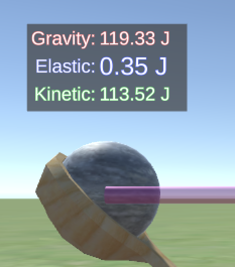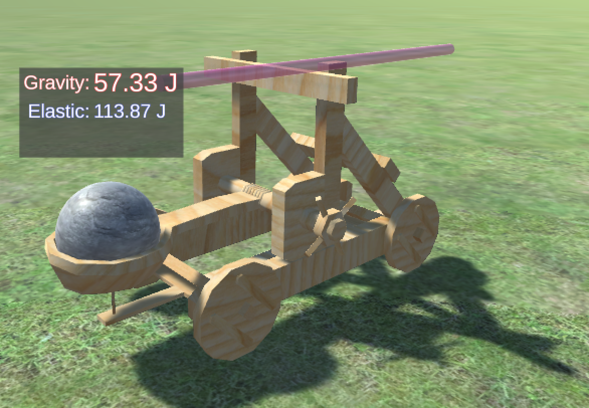 We encourage you to try it a few times with different values. Pay attention to the energy values as the arm starts moving and note the difference between the elastic energy being used to lift the arm and the kinetic energy that is put into the cannonball.