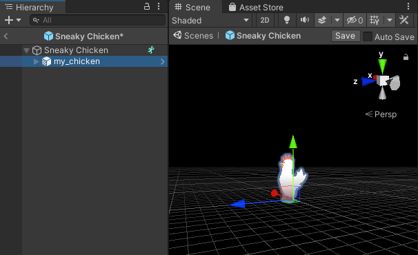 2. Drag and drop the “my_chicken” asset from the Project window to the Hierarchy of the Sneaky Chicken Prefab.