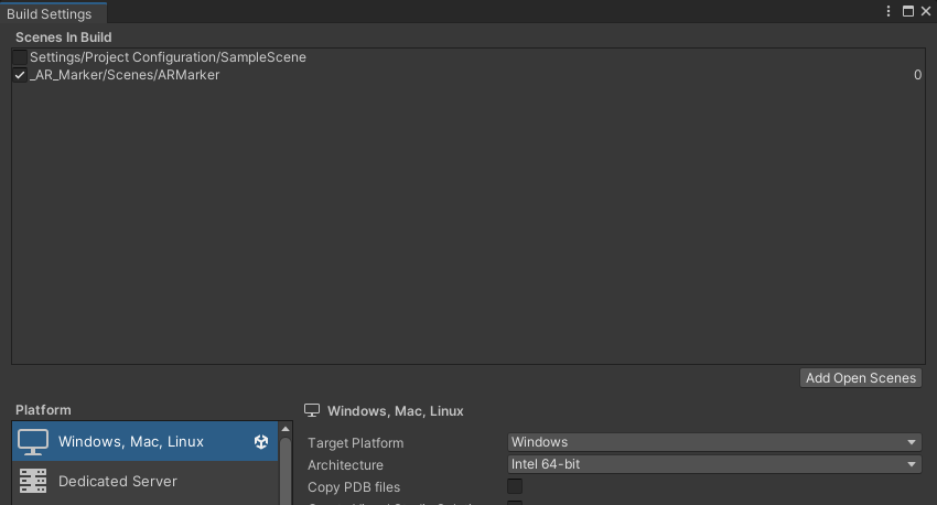 4. Below the Scenes in Build section, select Add Open Scenes to add your new ARMarker scene to the Scenes in Build list.