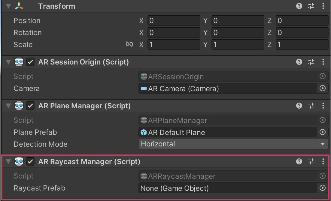 Previously, you added an AR Plane Manager component to manage planes detected in your scene. Similarly, you will need an AR Raycast Manager component to manage the rays cast in your scene. The AR Raycast Manager provides precisely the functionality that you need: it casts a ray from a screen touch position and determines whether that ray intersects with a trackable object, like a horizontal or vertical plane.