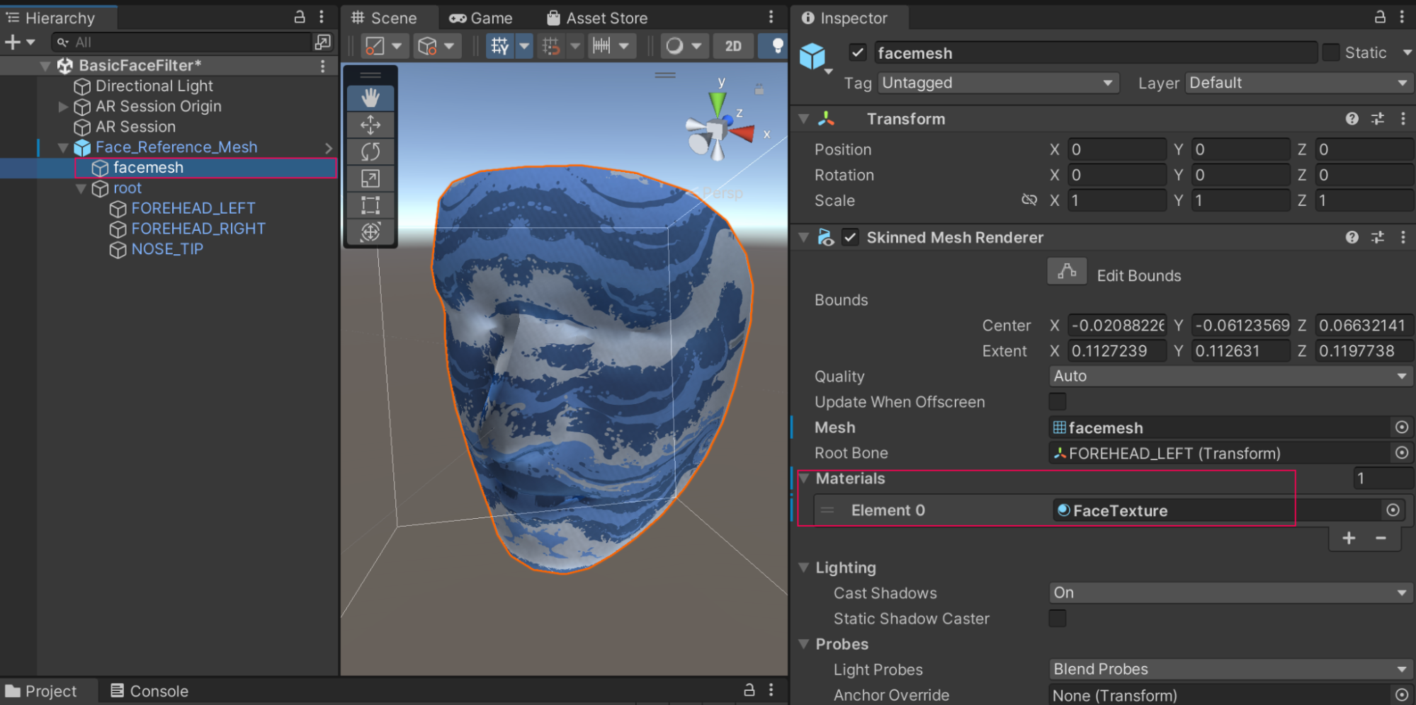 1. In the Project window, select the FaceTexture material (in Assets > _BasicFaceFilter > Materials).