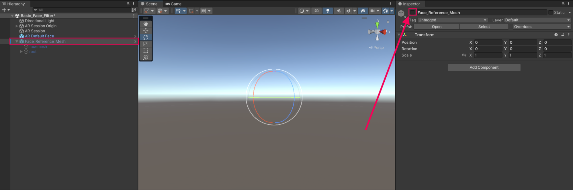 1. Open your AR Template Unity project and the BasicFaceFilter scene, if you haven’t already done so.