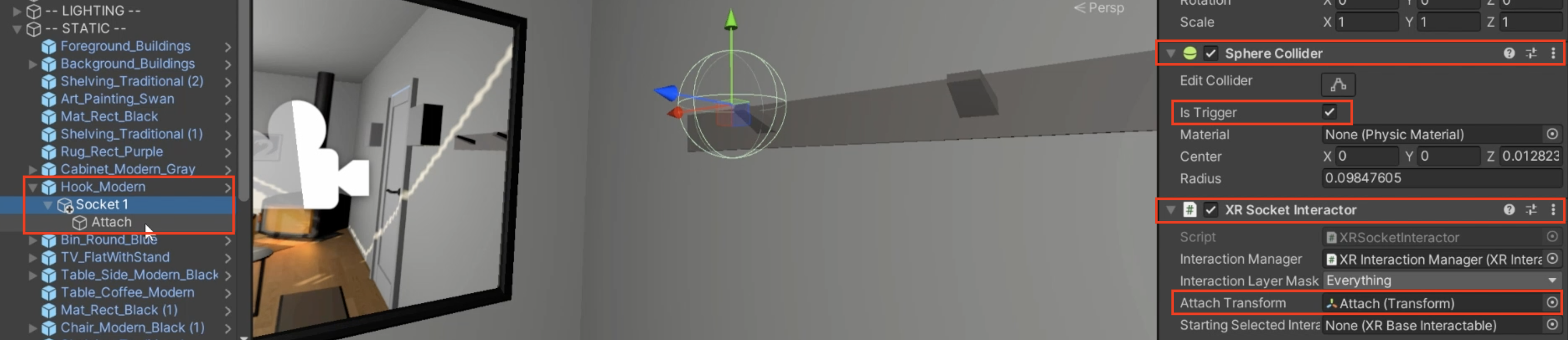 - To make a simple hook, create an empty object with a Socket Interactor component, then create a primitive cube child object, scaled and rotated appropriately, to represent the mesh.