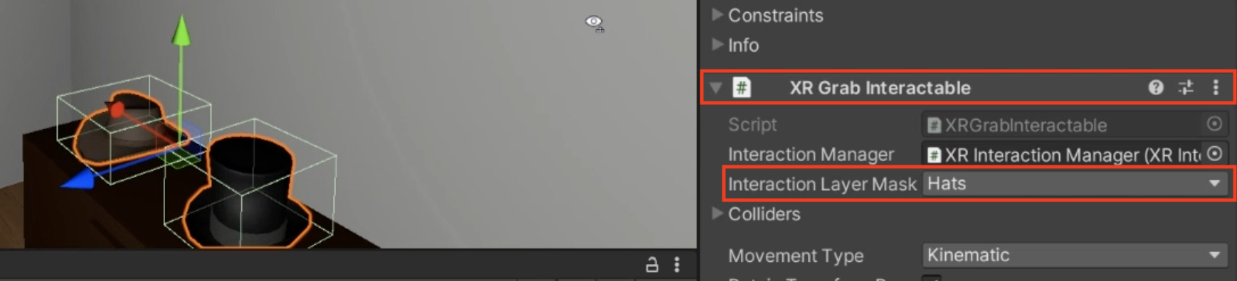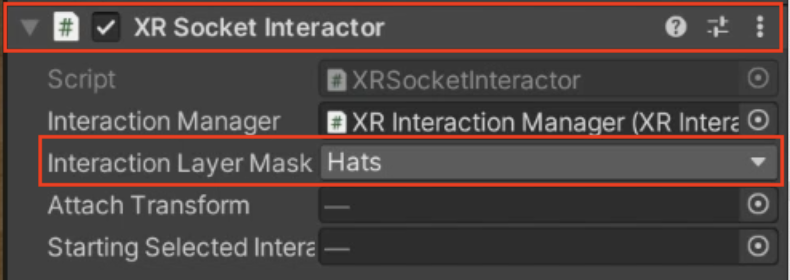 - Set each of the hook and head socket objects’ Interaction Layer Masks property to only the Hats layer.