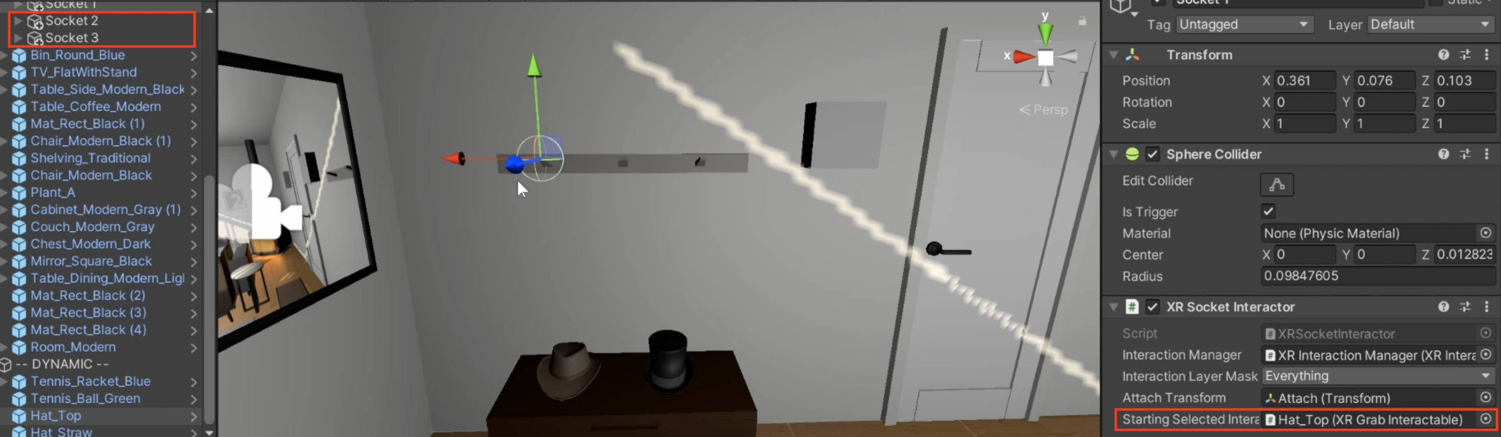- In each of the Socket object’s XR Socket Interactor components, assign one of your hats to the Starting Selected Interactable property.