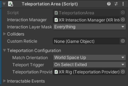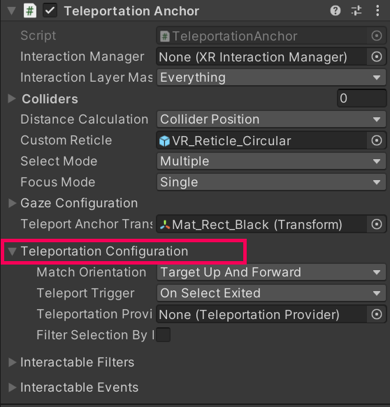 - Note: The Teleportation Configuration section might be collapsed by default. Use the foldout (triangle) to expand it in the Teleportation Anchor component.