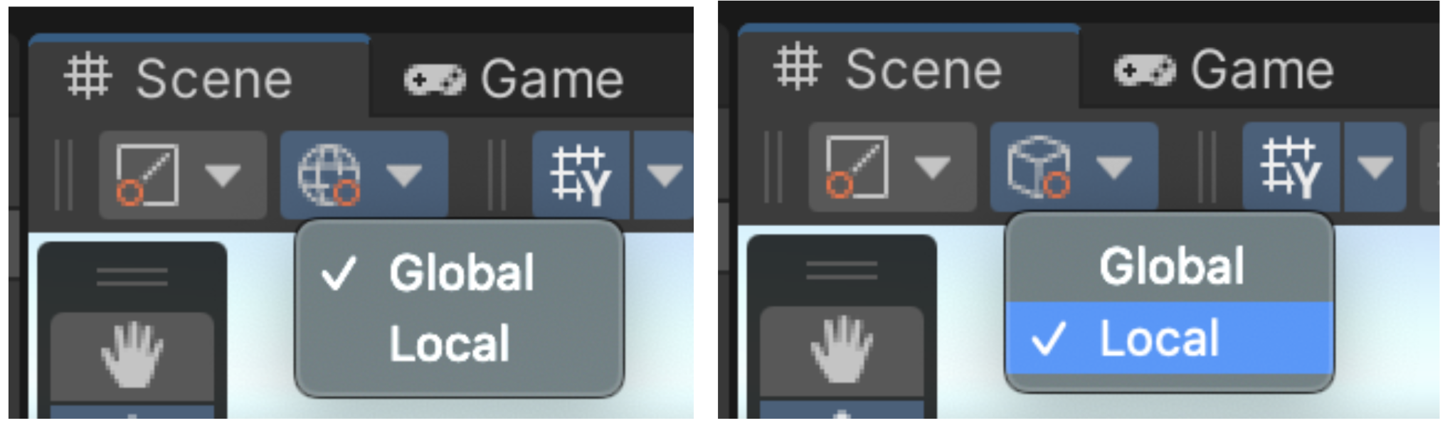 Depending on which version of Unity you’re using, the Local/Global settings might be represented by a Globe/Cube button dropdown in the upper-left corner of Scene view, or it might actually say the word Global or Local: