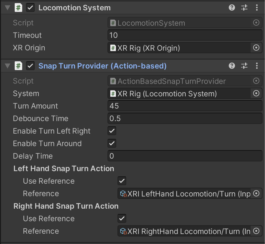 - With the XR Rig object still selected, add a Snap Turn Provider (Action-based) component.