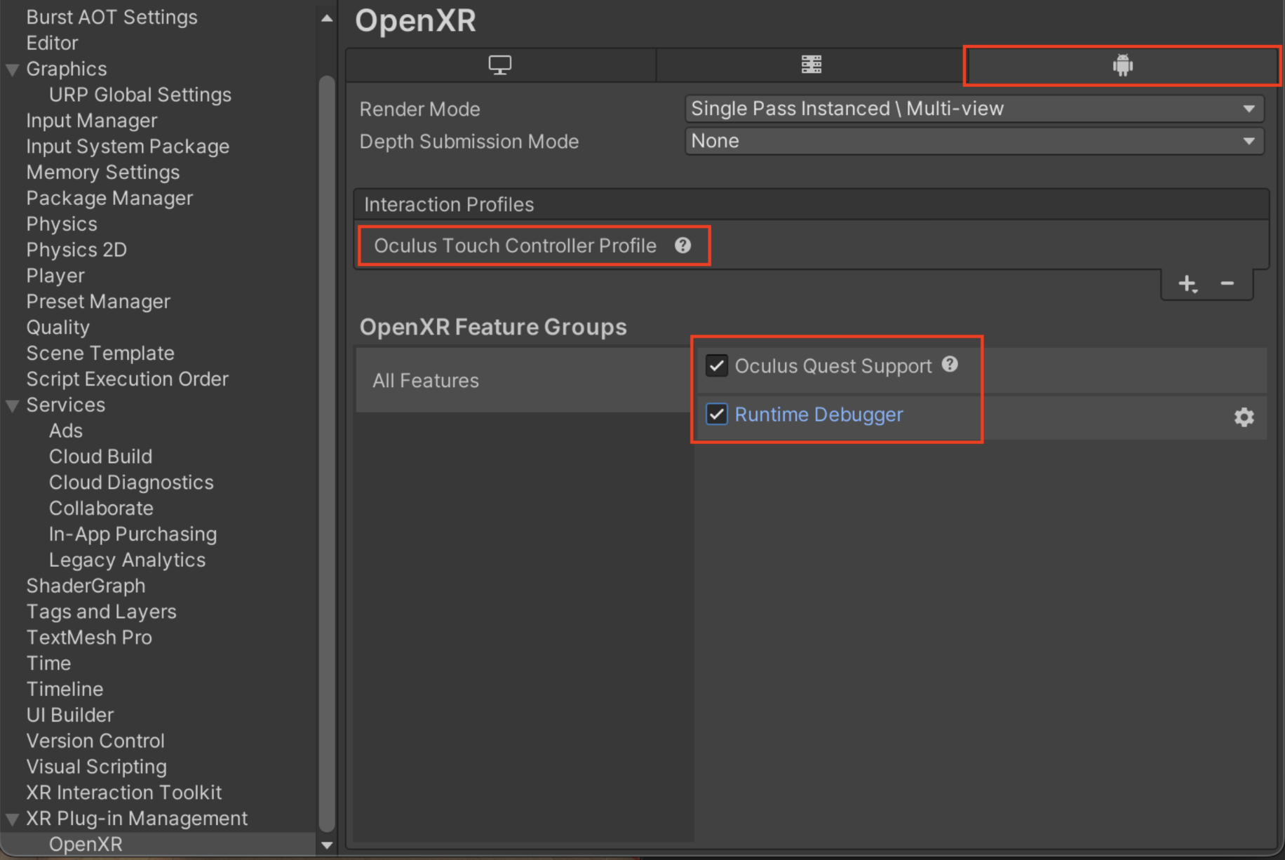 - In the Android tab, select the + button to add the appropriate profile for your device, then enable all OpenXR Feature Groups.
