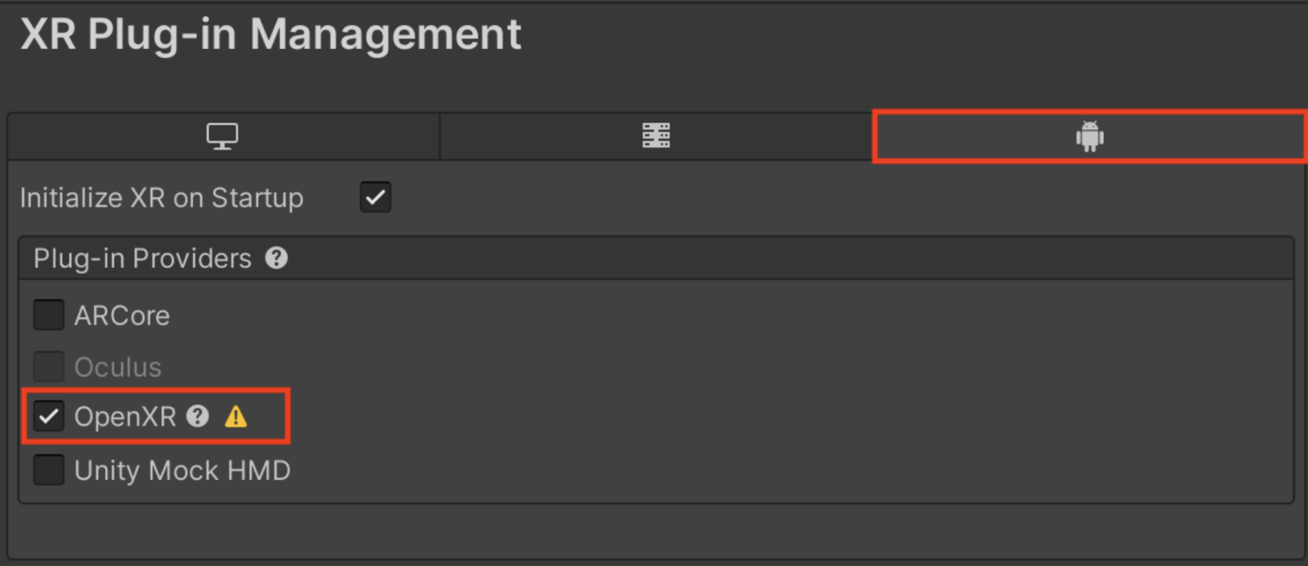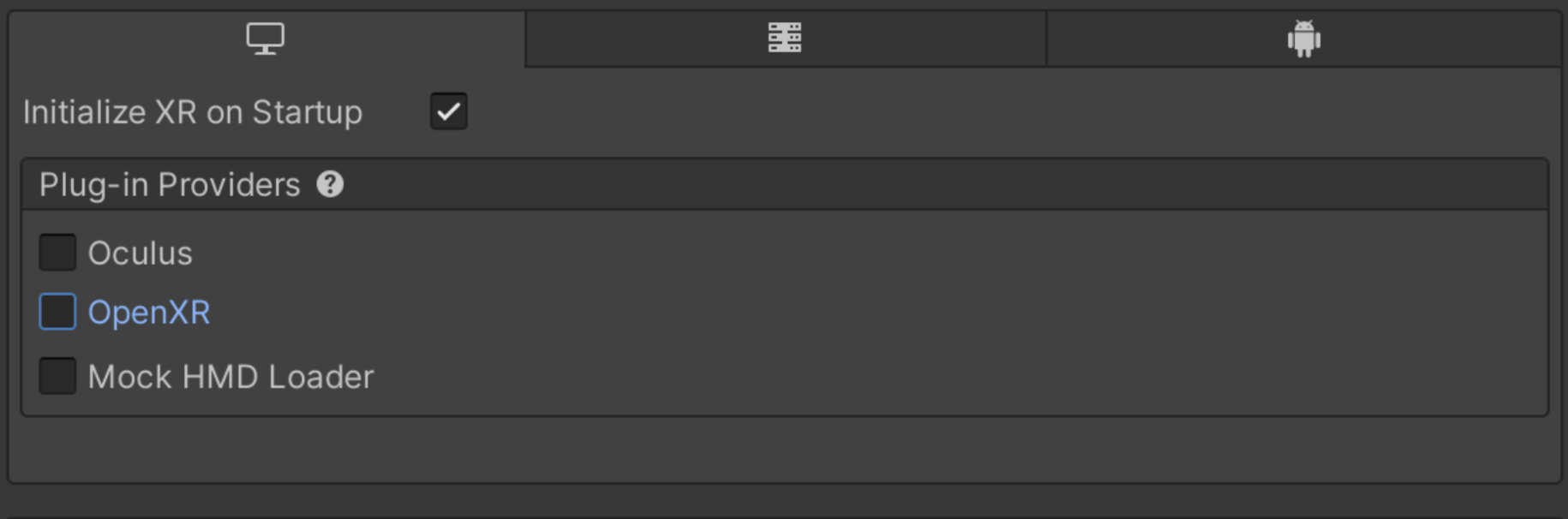 Note: You will only have an Android tab if you installed the Android export module. - If you don’t see an option for OpenXR in the Android tab, first go back to the Desktop tab and select OpenXR there, then return to the Android tab.