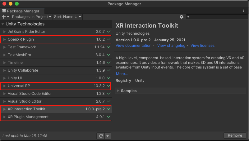 - Note: to filter and view only packages currently installed in the project, from the top-left corner of the Package Manager window, select Packages: In Project.