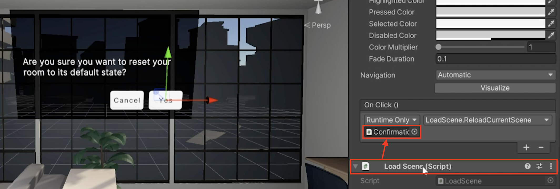 - In the On Click event, assign the Load Scene component and choose the Load Scene > ReloadCurrentScene () function.